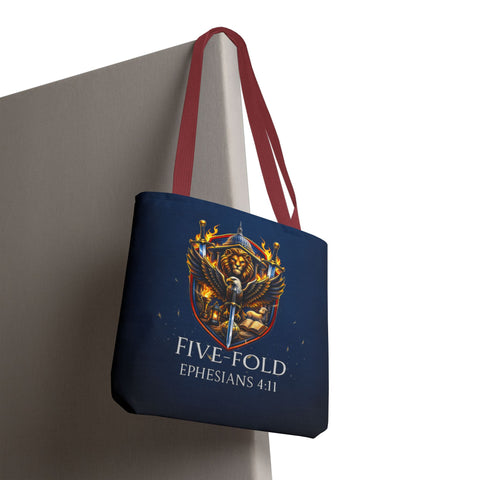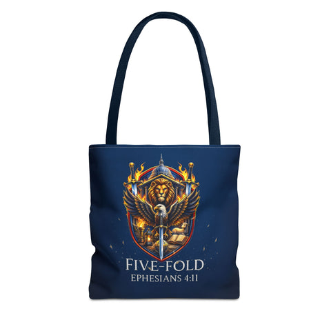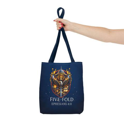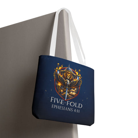 Carry your faith and strength with you every day. This sturdy tote brings a bold, heraldic design to deep navy fabric — a crowned lion, wings, and sword framed by a glowing crest with the words “FIVE-FOLD EPHESIANS 4:11.” It feels substantial but light, holds its shape, and gives your essentials room to breathe thanks to boxed corners and a roomy main compartment. Use it for church, study sessions, market runs, or when you want a quiet reminder of purpose and calling. The durable polyester body resists wear and dries fast; reinforced handle stitching keeps the strap secure when life gets busy. Choose from handle colors to match your style and pick the size that fits your routine.