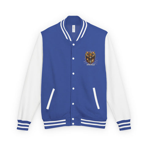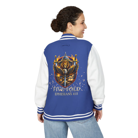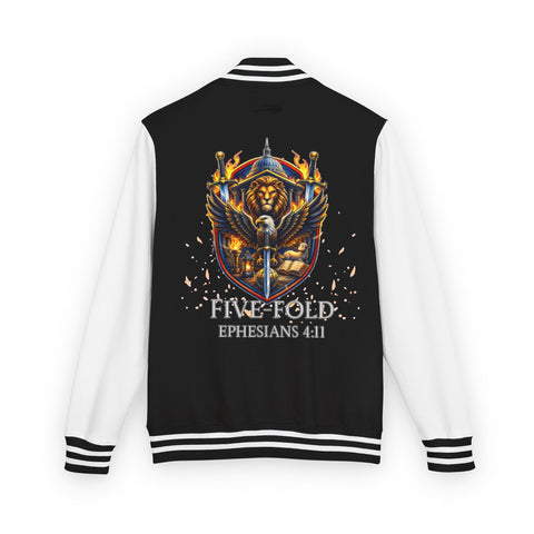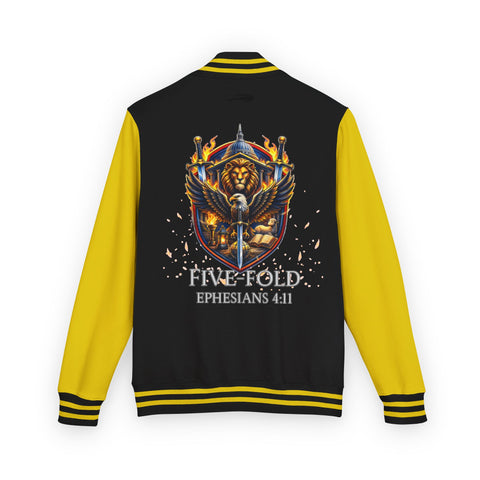 This heavyweight letterman jacket brings bold, emblematic style to faith-driven wardrobes. Built from soft ringspun cotton and polyester, its garment-dyed body and contrasting sleeves create that classic varsity silhouette while the back showcases a detailed crest: a lion, wings, and sword framed with heraldic flourishes and ‘Five-Fold Ephesians 4:11’ text.