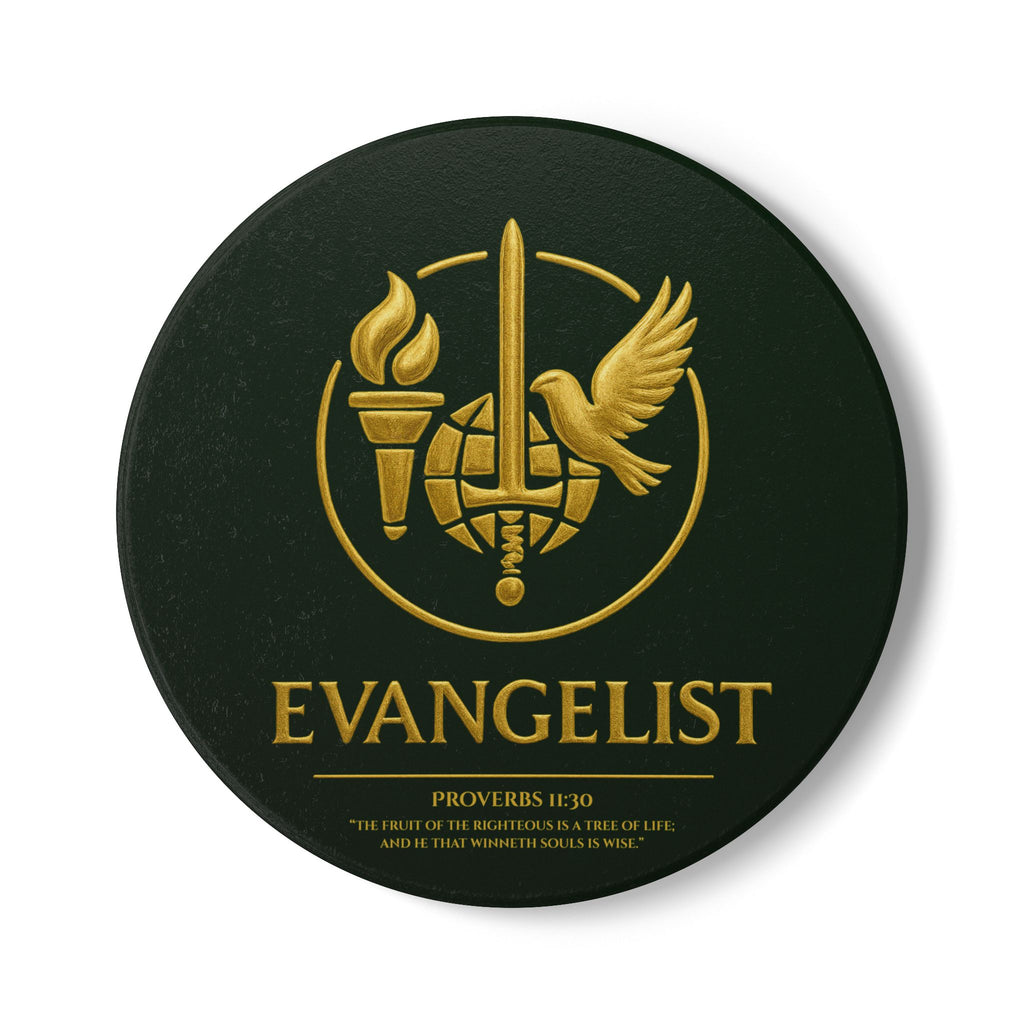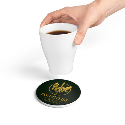A smooth, weighty ceramic coaster that brings a quiet, dignified presence to a coffee table or desk. The deep forest-green face carries a gold emblem — a torch, sword, globe and dove — with the word “EVANGELIST” beneath, giving this coaster a sense of purpose and reverence.